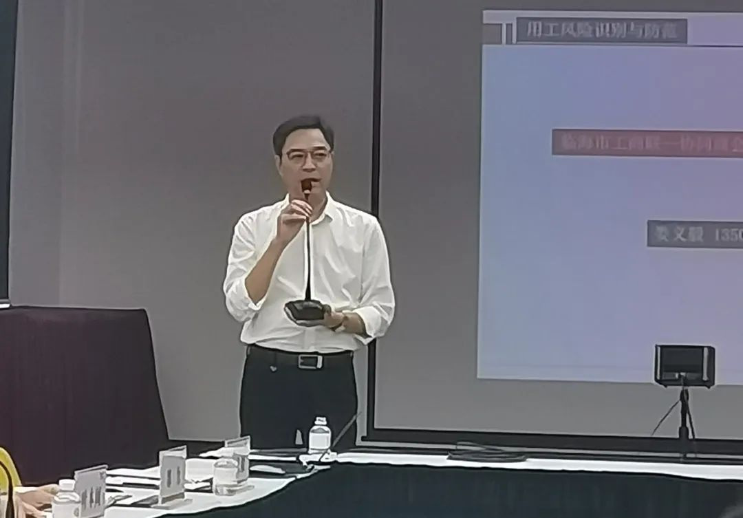 临海市工商联协同商会服务中心负责人娄义毅为企业作用工风险识别与防范培训,针对企业目前面临的劳动用工管理现状,为企业家提出具体的建议和改进措施。