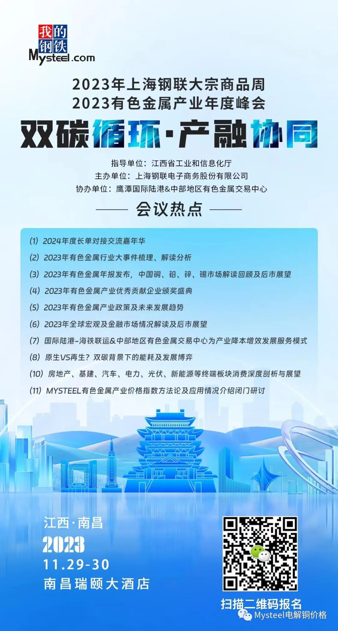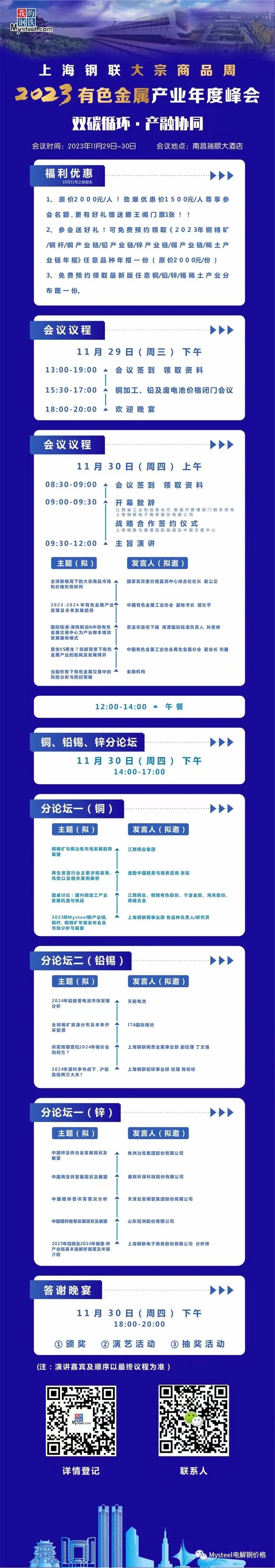 本次会议作为2023有色金属行业年度大戏,将力邀多位重磅专家、知名学者及行业大咖对有色市场进行全方位、多角度的深入解读,助力有色产业链参与者提前布局 2024。 让我们齐聚南昌,分享智慧,宏词论道,辩以明思,共同开辟行业和市场的新未来。我们期待您的关注和参与!