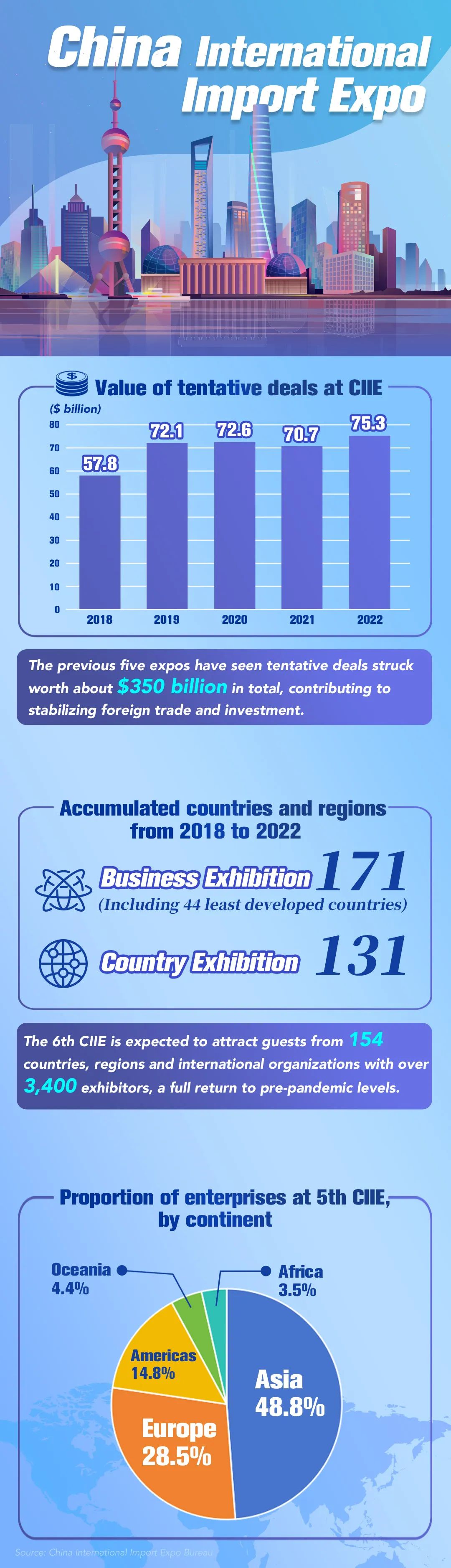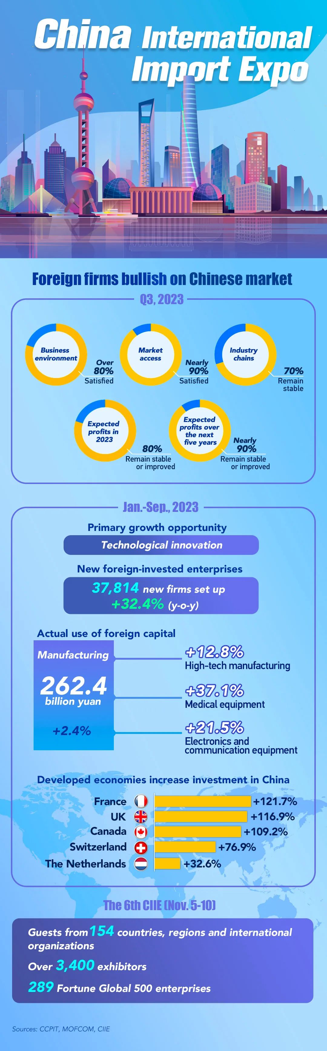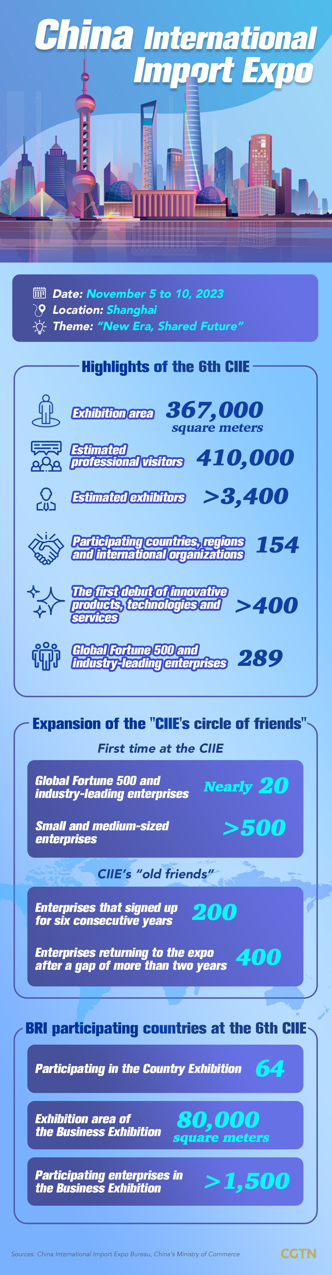 The sixth China International Import Expo (CIIE) opened in Shanghai on Sunday, creating a window of win-win opportunities for participating exhibitors. The CIIE continues to expand its circle of friends, with representatives from 154 countries, regions and international organizations this year. Over 3,400 exhibitors and 410,000 professional visitors have registered to attend the event.Among the 3,400 global companies participating this year, roughly 200 companies have been to every expo since 2018, and around 400 companies are returning to the expo after a gap of more than two years. Among the exhibitors in the Country Exhibition, an impressive 64 are from Belt and Road partner countries, underscoring their growing importance in global trade. Additionally, over 1,500 enterprises from BRI partner countries have enrolled for the Business Exhibition, covering a total exhibition area of nearly 80,000 square meters which is 30 percent larger than in the previous edition, according to Sun Chenghai, deputy director of the China International Import Expo Bureau.多家跨国公司表示,将在今年进博会上呈现最新创新成果,并期待借助“进博效应”,进一步开拓中国市场。进博会成功举办五年多来,一大批新产品、新技术首发首秀,累计意向成交额近3500亿美元。As the world's first national-level expo dedicated to imports, China International Import Expo (CIIE) underscores China's dedication to promoting high-level opening-up. 中国贸促会最新发布的第三季度《中国外资营商环境调研报告》显示,中国市场对外国公司仍然具有吸引力。2023年以来,众多跨国公司高管密集访华。他们普遍表示,中国市场是“必选项”,将持续加码在华投资、深耕中国市场。