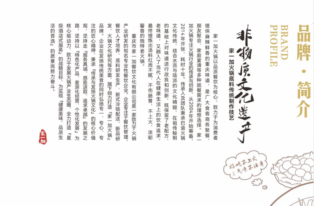 家一加火锅源自重庆洛碛镇长江码头,传承人自2004年继承了独特的古方锅底,此后十年,遍访全国各大省市及香港、澳门各类火锅的运营模式,结合水派与陆派火锅的特点,不断对配方进行改良创新,并融入了当代人对健康生活和饮食的追求,形成了家一加如今独具特色的新巴渝文化火锅。