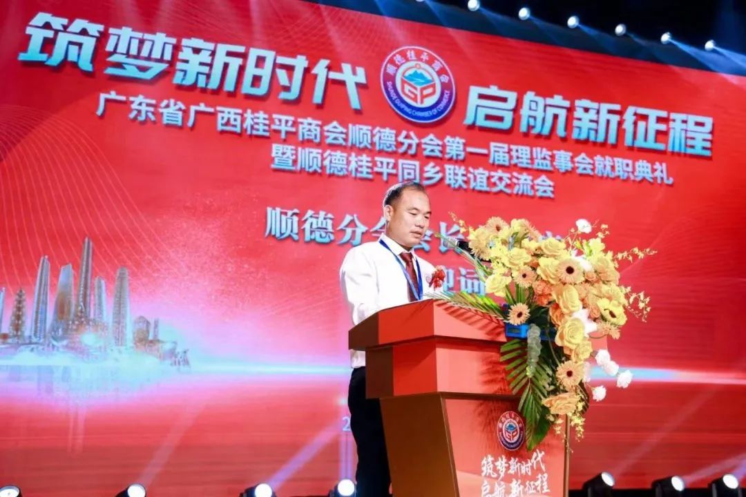 广东省广西桂平商会顺德分会新当选会长梁汉广致欢迎词。
