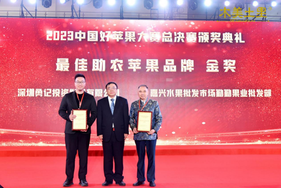 随后,在2023中国好苹果大赛总决赛颁奖典礼上,由陕西省归国华侨联合会副主席余劲为深圳勇记投资发展有限公司和嘉兴水果批发市场勤勤果业批发部颁发最佳助农苹果品牌金奖。