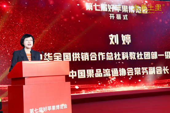 开幕式于上午9点准时开始,在热烈的掌声中,中华全国供销合作总社科教社团部一级巡视员 中国果品流通协会常务副会长刘婷登台致辞。刘会长对国内苹果产业取得的成就表示赞赏,同时也表示苹果产业进入了新的发展阶段,应当从多方面着力打造开发新空间。