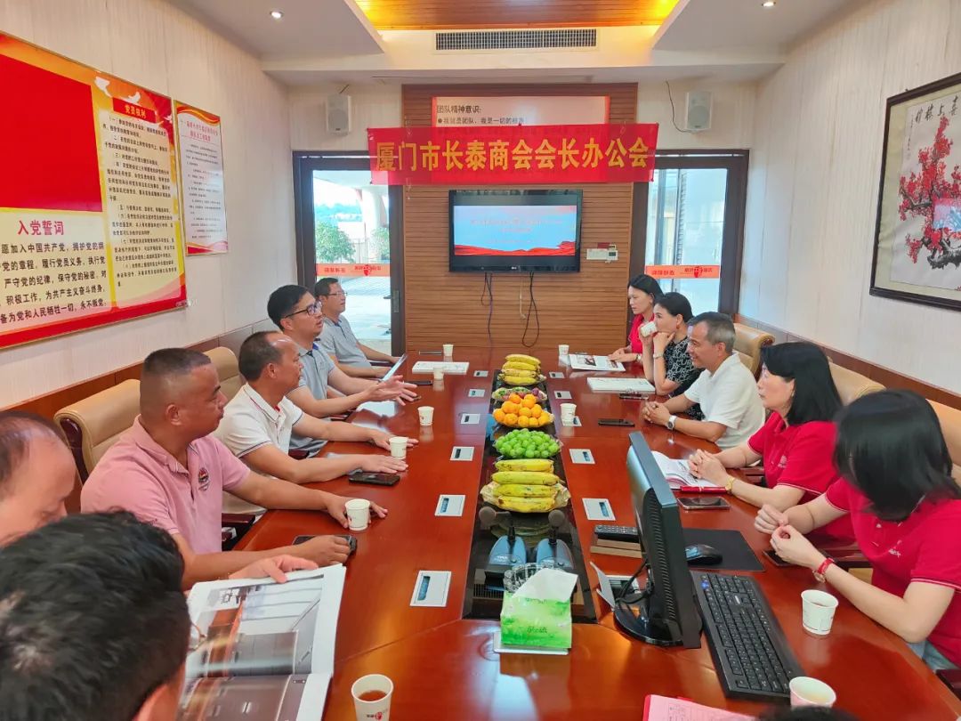 此次会长办公会组织商会副会长以上人员学习党的路线方针政策,学习《习近平致中华全国工商业联合会成立 70 周年的贺信》,对2023年第二、三季度工作进行总结和下一阶段工作布置。会议通过了会员大会相关事项,厦门市长泰商会第三届顾问委员会名单,各专业委员会轮值开展工作,进一步加强与翔安区内厝镇赵岗村结对帮扶工作,推荐2023年度优秀会员名单等事项。