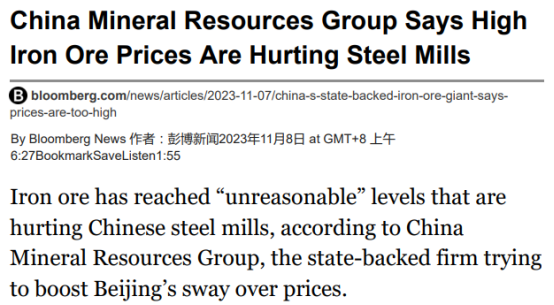 据彭博社(Bloomberg)报道,中国矿产资源集团(China Mineral Resources Group, CMRG)表示,铁矿石已达到“不合理”的水平,这对中国(CHN)的钢铁厂造成了不利影响。