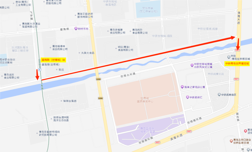 2.铁路青岛北站:青岛北站乘坐1号线→井冈山路站换乘地铁13号线→盛海路(世博城)站。