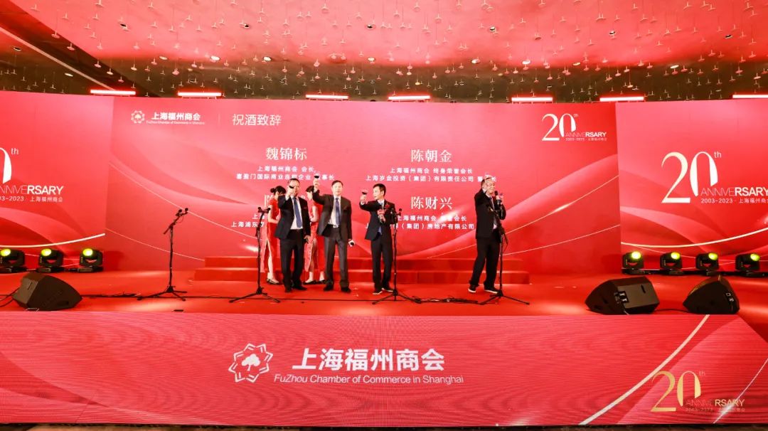 18:50,上海福州商会成立二十周年华诞庆典招待晚宴正式开启。魏锦标会长、陈朝金终身荣誉会长、陈枝城监事长、陈财兴荣誉会长集体登台祝酒。