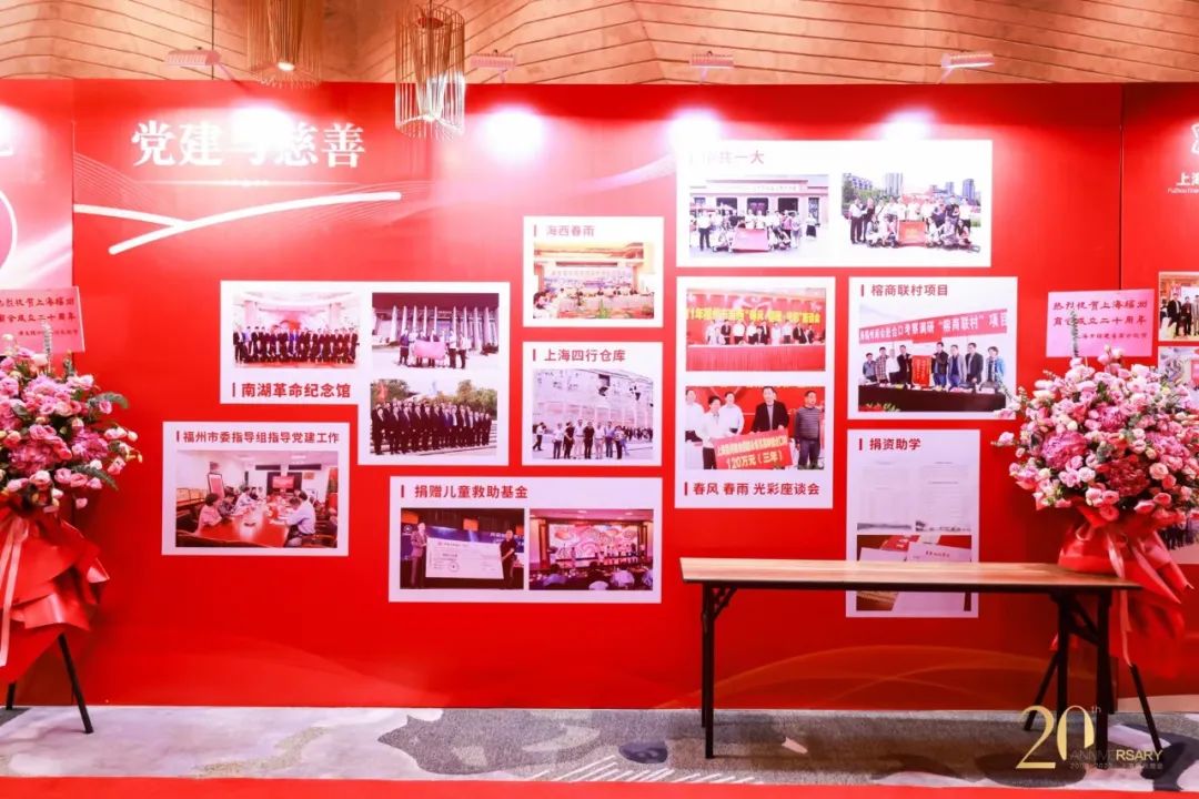 会场巨型迎宾门廊内花团锦簇,红毯直通会场。艺术签到墙和红色背景板烘托出浓浓的节日喜庆氛围。会长寄语、商会换届历程、党建与慈善、“学习型”和谐商会建设、商会文化、历届会长名单等六块巨幅展示版,精彩呈现商会20年成长历程和斐然业绩。