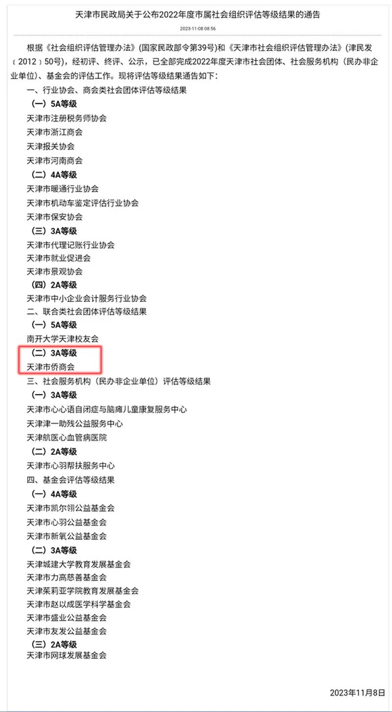 11月8日,天津市民政局通过天津社会组织公共服务平台发布了《天津市民政局关于公布2022年度市属社会组织评估等级结果的通告》,通告中指出,根据《社会组织评估管理办法》(国家民政部令第39号)和《天津市社会组织评估管理办法》(津民发﹝2012﹞50号),经初评、终评、公示,天津市侨商会在2022年度天津市社会团体、社会服务机构(民办非企业单位)、基金会的评估工作中,被评估为3A等级社会团体。