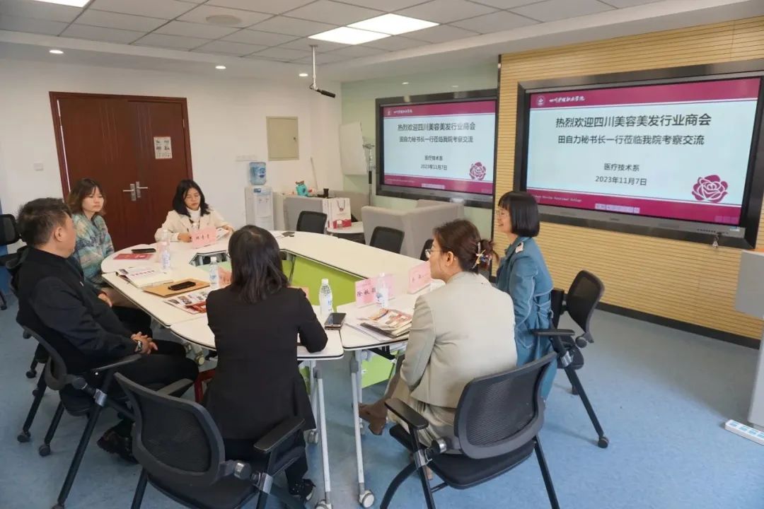 11月7日10:30,四川商会秘书长田自力一行到访四川护理职业学院,与四川护理职业学院医疗技术系主任王景、副主任徐秋颖、医美教研室主任乔敏、办公室主任李吉霞四位老师针对行业商协会与学校合作开展产教融合、师资共享、参加技能竞赛等方面展开详细交流,并参观了四川护理职业学院医学美容实训中心。