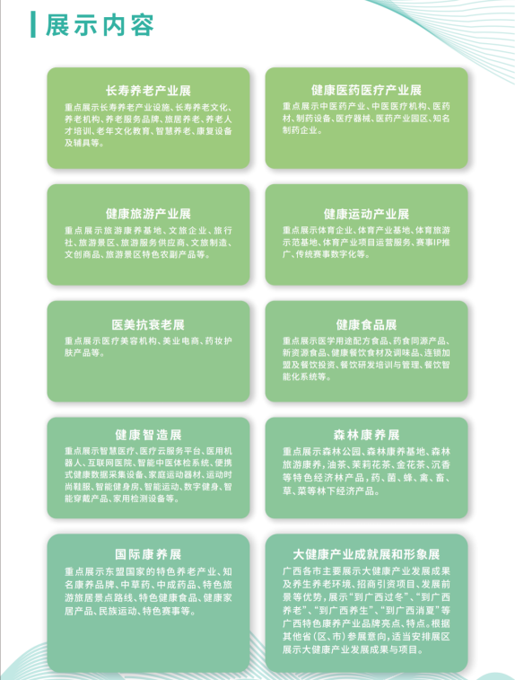 本届博览会将充分发挥广西作为“一带一路”有机衔接重要门户和面向东盟国家开放合作前沿窗口的区位优势,推动中国与东盟国家之间大健康产业的国际交流与合作。进一步发挥广西“山清水秀”、“气候宜人”、“物产丰富”、“绿色优质”、“长寿福地”的优势,深化与国内各省份大健康产业交流合作。为投资方和咨询方提供一个专业的平台,行业内人士将获得市场拓展、技术交流、投资合作的绝好机会,参展商和观众可以与业内同行、专家学者进行深入交流,分享最新的市场趋势和技术成果,创造更多商业机会和价值。