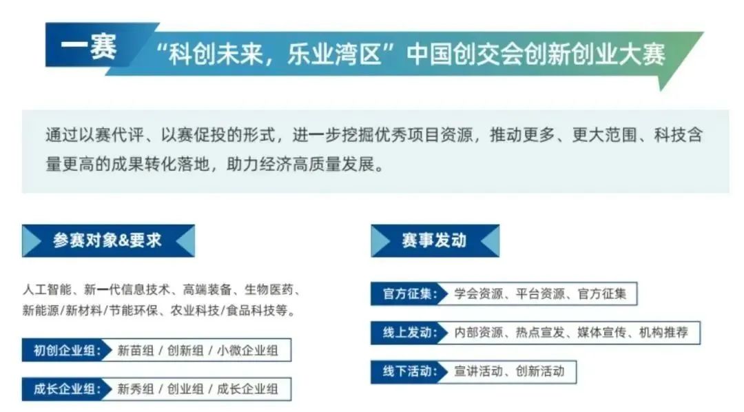 “科创未来·乐湾区”中国创交会创新创业大赛。通过以赛代评,以赛促投的形式,进一步挖掘优秀项目资源,推动更多、更大范围、科技含量更高的成果转化落地,助力经济高质量发展。