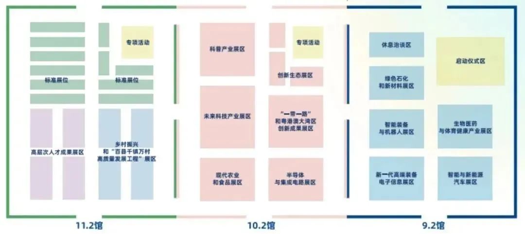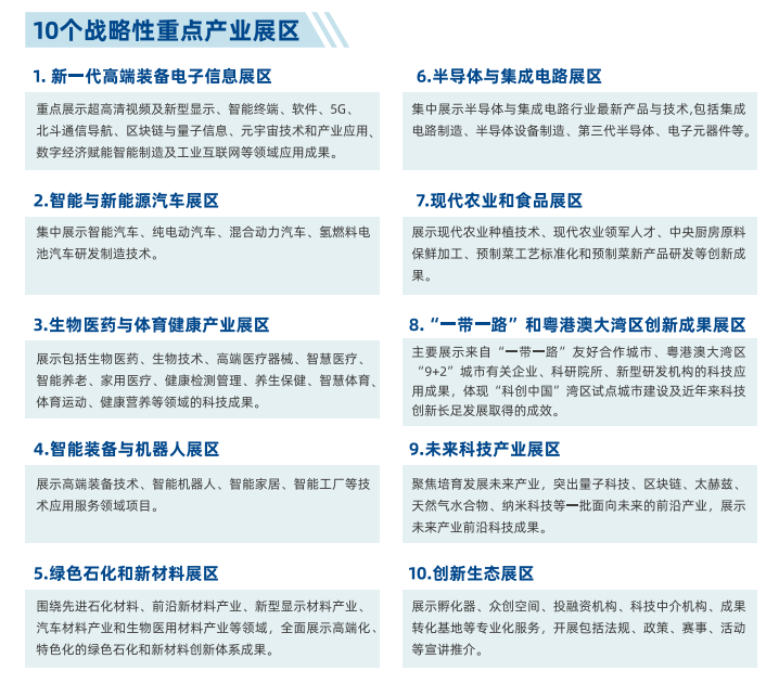 设有3万平方米展位,包括新一代高端装备电子信息、智能与新能源汽车、生物医药与体育健康产业、智能装备与机器人、绿色石化和新材料等10个战略性重点产业展区,以及3个重要功能区。