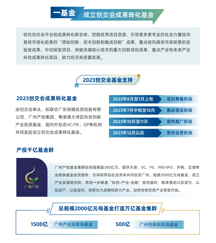 由创交会牵头,拟联合广东恒健投资控股有限公司、广州产投集团、粤港澳大湾区科技创新产业投资基金、国内外知名VC/PE、GP等机构,共同发起设立创交会成果转化基金,可为参会者提供园区产业载体、成果转化、投融资对接等全链条服务,为创新创业成果在中国落地转化提供支持。