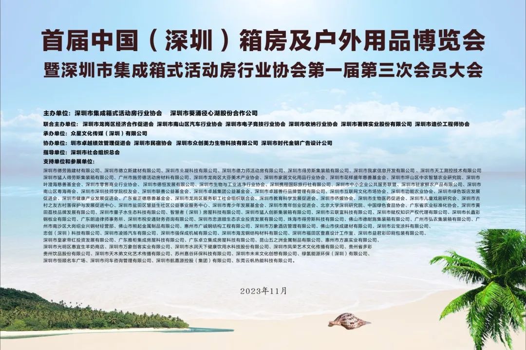 由深圳箱房协会组织召开的首届中国(深圳)箱房及户外用品博览会在11月10号召开。展会为期三天,时间为2023年11月10日至2023年11月12日。举办地点为深圳箱房协会引领落地的项目——坝光海月创意营地。参展方式为免费参展。