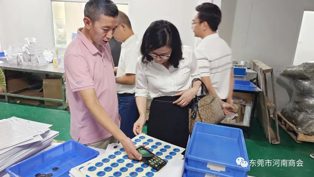 走访活动中,商会一行在东莞市河南商会副会长、深圳万联智能实业有限公司董事长杨新建的带领下,先后参观了公司产品展馆、生产车间、直播间等,了解公司产品核心环节,近距离感受智能卡产品全产业链标准化生产流程。