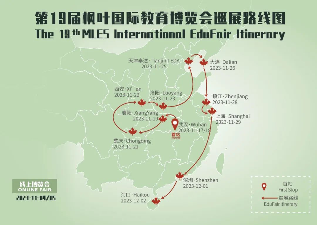 由枫叶教育集团主办,枫叶各高中校区承办的第十九届枫叶国际教育博览会将于11月17日正式启幕。11月17日起,来自英国、加拿大、中国、新加坡、瑞士、美国、澳大利亚、日本等10个国家64所海内外高校及机构将分别参加在武汉、襄阳、重庆、西安、洛阳、天津、大连、镇江、上海、深圳、海口共11个城市举办的巡展。