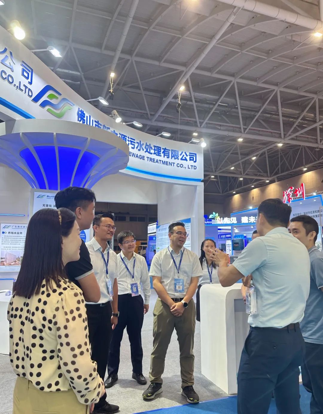 另外,在本次博览会中,我司陆续参观走访了多家企业的展示区域,与同行、区内兄弟单位进行了交流学习,在佛山市禅城区公用事业有限公司展位,了解城市服务管理的相关内容;在盈峰环境公司展位,参观最新的子母式排水抢险车,探讨排水抢险车方面的专业内容;在广东佛水建设有限公司展位,就排水工程、污水处理等方面内容进行了沟通了解。