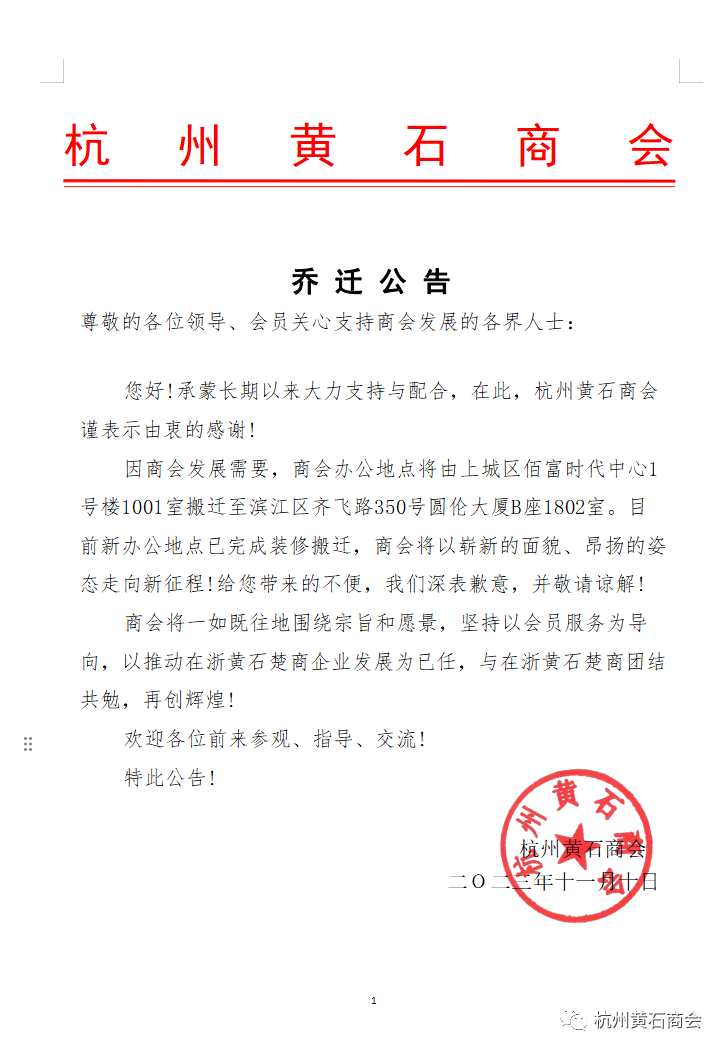 因商会发展需要,商会办公地点将由上城区佰富时代中心1号楼1001室搬迁至滨江区齐飞路350号圆伦大厦B座1802室。目前新办公地点已完成装修搬迁,商会将以崭新的面貌、昂扬的姿态走向新征程!给您带来的不便,我们深表歉意,并敬请谅解!