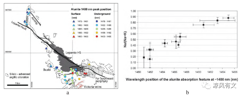 在蚀变填图的基础上,利用典型矿物SWIR光谱特征参数变化来直接定位热液矿化中心,已成为SWIR光谱勘查的核心内容(Chang et al., 2011; 杨志明等, 2012; 张世涛等, 2017)。由于受化学成分和/或温度的控制,某些蚀变矿物对SWIR光谱特征吸收峰有显著的变化,如明矾石1480 nm H₂O吸收峰位、绿泥石2250 nm Fe-OH吸收峰位和云母类2200 nm Al-OH吸收峰位及IC值等,这些参数变化对指示热液矿化中心都具有重要的作用。例如,Chang等(2011)对菲律宾Lepanto高硫型浅成低温热液Cu-Au矿床进行研究,发现其SWIR光谱特征变化明显,标志峰值1480 nm位置与K及Na含量相关,即高K含量导致低1480nm值,而高Na含量对应高1480 nm值。实验表明明矾石中的K/Na含量与温度相关,即高温明矾石一般具有较高Na含量,而低温则含K较高。因此,利用明矾石1480 nm谱线值可以很好指示导致高硫蚀变热源(即斑岩体)的来源方向,从而帮助发现邻近侵入体的高品位浅成低温金矿体或者隐伏的斑岩矿体(图7)。