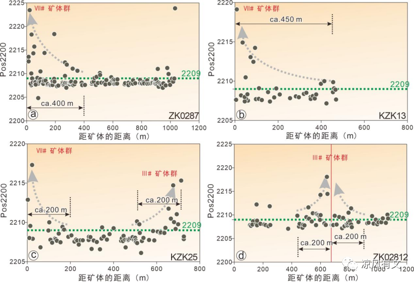 图9 鄂东南鸡冠嘴矽卡岩型金铜矿床典型钻孔云母类矿物Pos2200值与距离主矿体距离的相关性图(Tian et al., 2019)