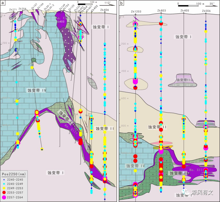图8 铜绿山矽卡岩型铜金铁矿床典型剖面绿泥石Pos2250空间变化特征(Zhang et al., 2020)