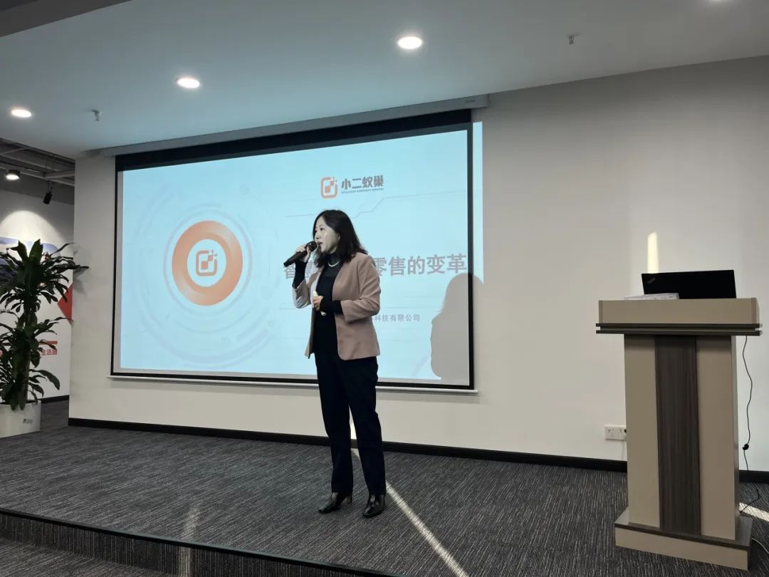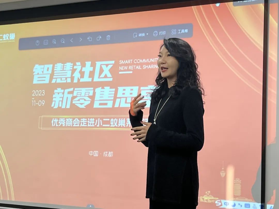 小二蚁巢联合创始人彭宏渝介绍了智慧社区新零售行业的现状与突破点。她表示,当下零售行业的现状为线上红利殆尽、线下一片硝烟,市场越来越下沉,她认为社区商业发展的核心是客户在门店的留存时长和面对面的温度服务,小二蚁巢通过创新体验式消费场景,线上线下的融合,开辟出社区零售业的新模式,为社区居民提供更便捷、更优质的服务。