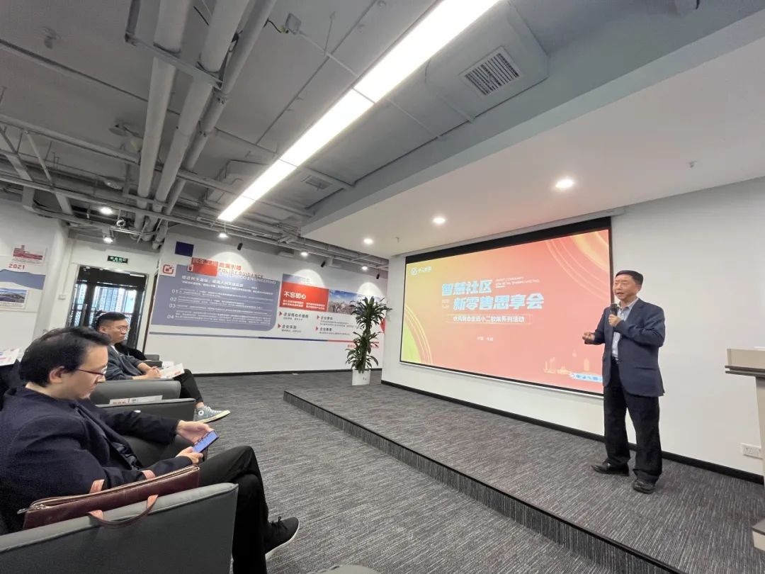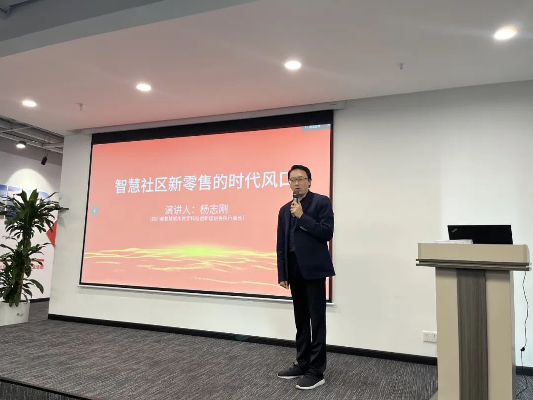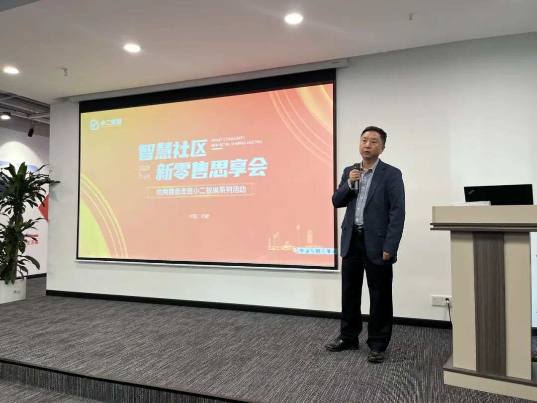 铜梁商会会长、成都千嘉科技有限公司党委书记赵勇分享了近年来对于智慧社区的探索与观察。他指出,智慧社区是城市发展的必然趋势,也是居民生活的重要保障。在这个背景下,小二蚁巢公司通过创新消费场景,开辟出一条蓝海赛道;四川省智慧城市数字科技创新促进会执行会长杨志刚详细分析了社区新零售的行业现状以及关于新零售时代风口的方向。