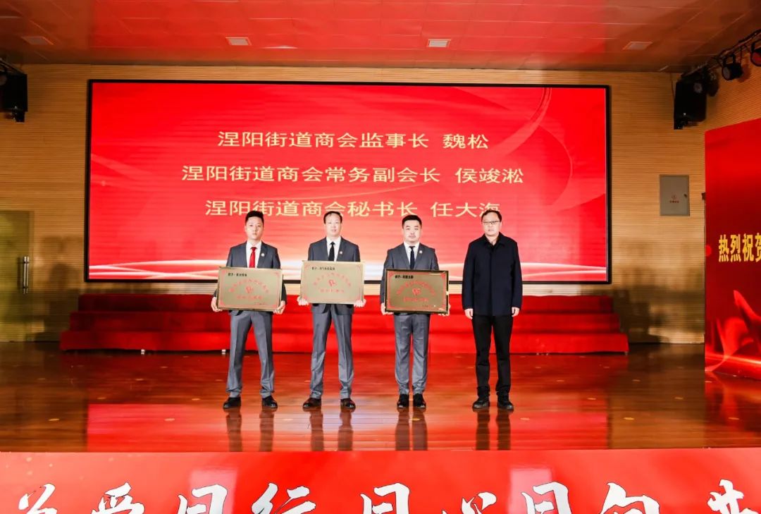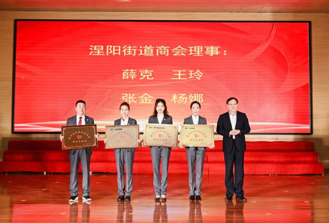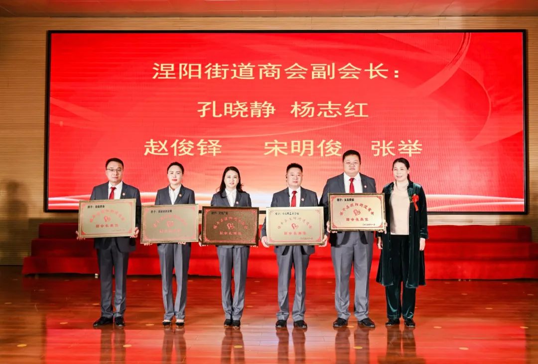 涅阳街道办事处主任刘海洋为新当选的涅阳街道商会监事长、常务副会长以及秘书长授牌