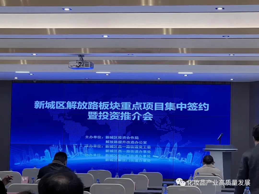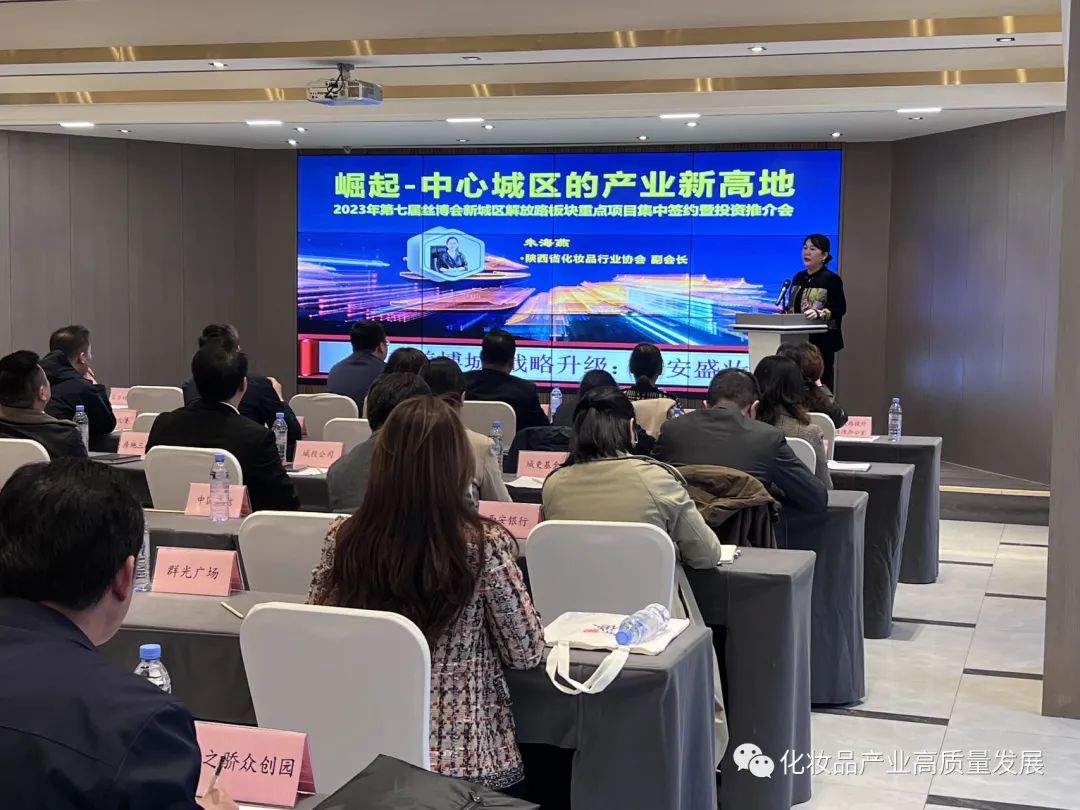 2023年11月9日,在第七届丝博会西安市新城区解放路板块重点项目集中签约暨投资推介会上,陕西省化妆品行业协会副会长朱海燕代表协会及“长安盛妆”项目建设单位,进行推介讲解,再次获得关注,为推进项目建设迈出坚实步伐。
