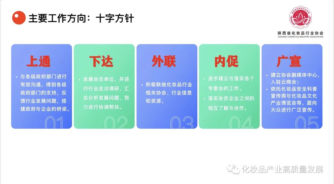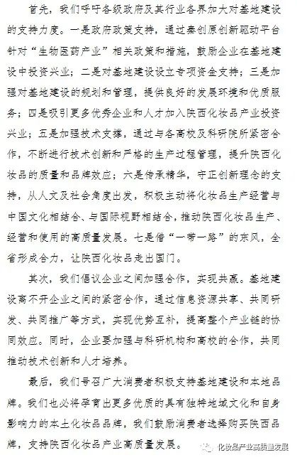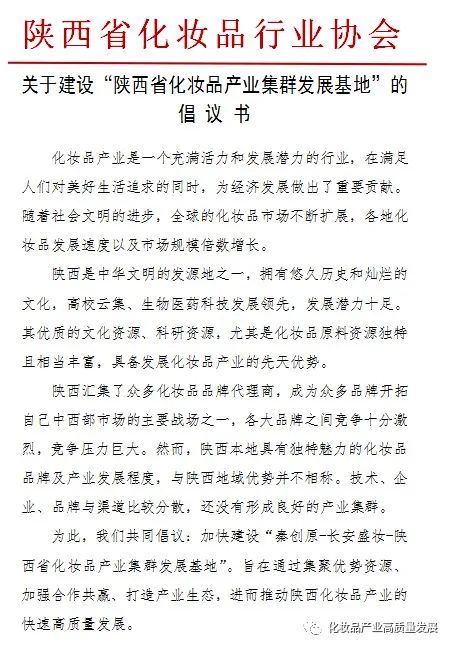 陕西省化妆品行业协会,成立伊始,就已经明确“上通、下达、外联、内促、广宣”的十字方针,为此全力搭建政府、行业、产业、企业、市场、消费者等众多环节的桥梁和平台,落实到行业培训、技术标准、产业集群发展基地、大型文化产业博览会等重点工作,发起倡议书,得到众多企业热烈响应。