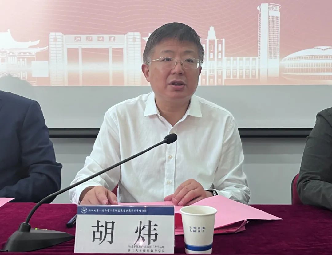 胡炜在致辞中代表浙江大学向培训班学员表示欢迎,并详细介绍了浙江大学的发展历程、发展现状、干部教育培训基地的基本情况以及培训纪律要求。他希望学员们能够及时转变角色,沉下心来,潜心学习;端正学习态度,提高学习主动性、注重学习实践性、保持学习严肃性,确保学习取得实效;强化组织观念,遵守纪律,服从安排;做到学以致用,用以促学,学用相长,努力将所学所思转化为推动商会党建高质量发展的具体行动,争做商会党建工作的“行家里手”。