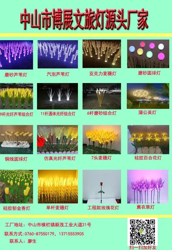 中山市博展照明灯具公司毗邻于世界灯都古镇,位于横栏镇新茂工业区,成立于2005年至今,公司面积3000多平方米,员工50多人。本公司是一家文旅灯光源头厂家,拥有注塑模具及产品设计开发能力,先进的注塑机十多台,自主研发及生产各类型仿真插地花灯配件到组装,本公司拥有数十项开发专利,主营产品有:文旅灯光、插地花灯、水母灯、麦穗灯、玫瑰花灯、蒲公英灯、芦苇灯、向日葵灯、郁金香花灯、水稻灯、景观灯、庭院灯、亮化工程灯等。