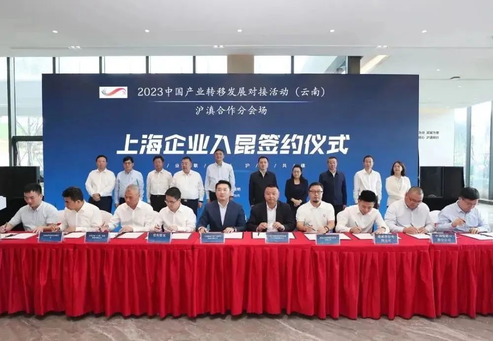 2023中国产业转移发展对接活动(云南)沪滇合作专场——上海企业入昆签约仪式在昆明经开区(自贸试验区昆明片区)举办,24家企业签订了战略合作协议,承接产业转移,打造产业链供应链新体系,共建沪滇产业合作新高地。