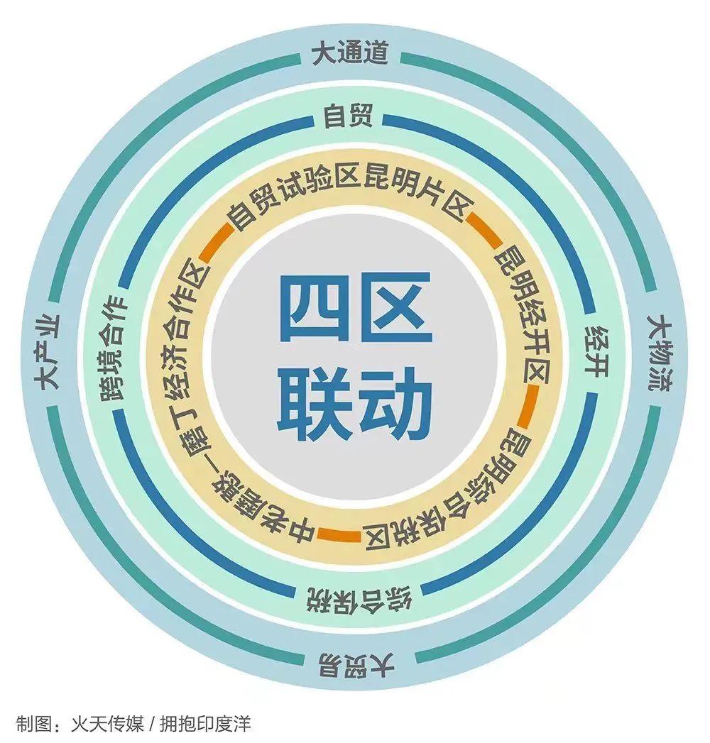 2022年,昆明托管磨憨,成为中国唯一一座有“边境线”的省会城市;中国(云南)自由贸易试验区昆明片区、国家级昆明经济技术开发区、昆明综合保税区、中老磨憨—磨丁经济合作区“四区联动”发展模式全国首创,昆明经开区(自贸试验区昆明片区)由此成为全国唯一一个拥有自贸、经开、保税、跨境合作并具备口岸功能的开放型特色园区,站上了连接南亚东南亚大通道重要节点的时代风口。