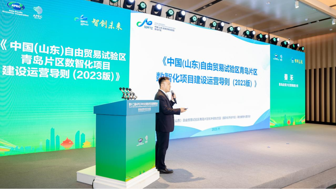 青岛自贸片区管委副主任秦禾在会上发布了《中国(山东)自由贸易试验区青岛片区数智化项目建设运营导则2023版)》,该导则通过逐步构建片区数智化建设标准体系,将为片区各项工作提供基础理论支撑,促进智能业务场景从基础数据到应用系统建设的全面整合与协同。