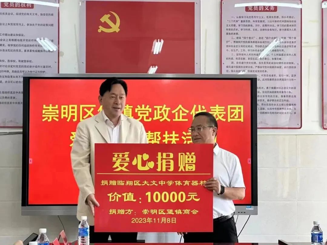 企业家代表们为大文中学捐赠体育器材。活动中,受资助学生纷纷向资助他们的爱心企业家代表们表示感谢,同时也表示今后要好好学习,不辜负崇明叔叔阿姨们的关心与帮助。