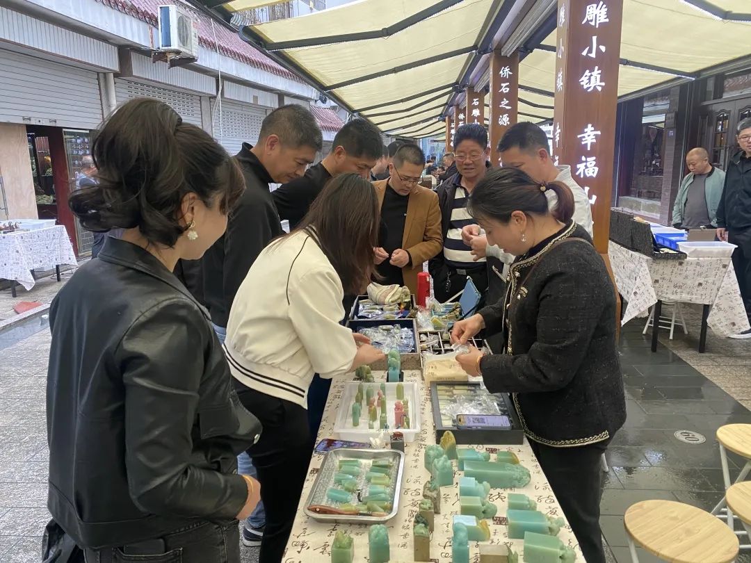 现场摊位上整齐摆放着原石、印章、石雕、挂件等各式各样的“宝贝”,琳琅满目的作品吸引了不少石雕爱好者和游客前来“寻宝”,大家还聚在摊位前互相交流选购经验,现场热闹非凡。据了解,淘宝市场占地面积300多平方米,目前已有70家石雕商户进驻,当天总销售额超10万元。