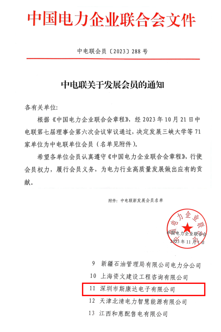 近日,【深圳市斯康达电子有限公司】顺利通过【中国电力企业联合会】理事会审议,正式成为中电联会员单位成员。