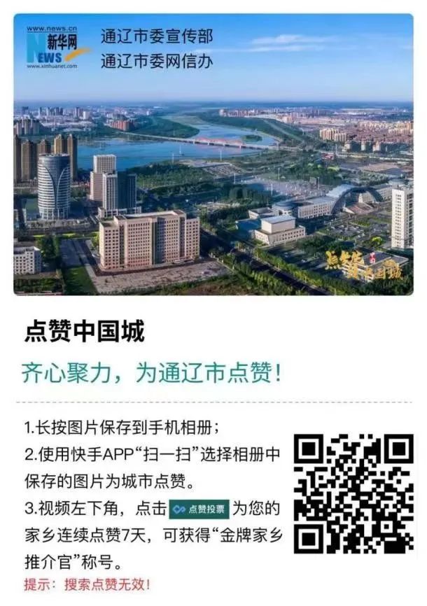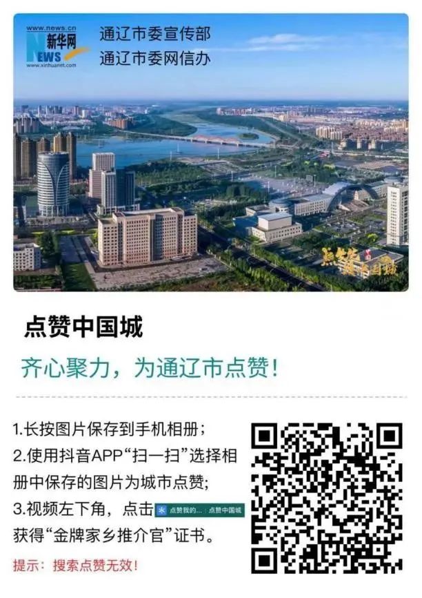 扫描下方二维码,在抖音和快手平台“点赞我的家乡”小程序为家乡点赞,即可获得“金牌家乡推介官”证书,让我们携手同心,为家乡点赞,为宣传推介家乡共同努力,让通辽的明天更美好!