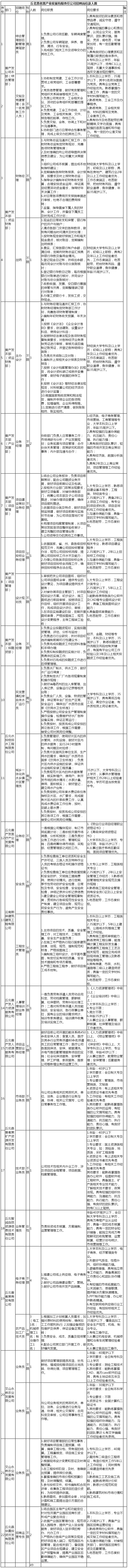 丘北普者黑产业发展有限责任公司是丘北县属国有独资公司,成立于2021年12月28日,由县国资局授权云南云丘国资控股集团有限责任公司履行股东职责,注册资本1亿元,资产总额33.6亿元。公司是集焦产业发展项目投资、融资、建设和运营为一体,着力发展市场化经营性业务的综合性企业,主要业务板块有:项目管理和工程建设、商贸物流和现代农业、新型能源、文旅康养及公共事业特许经营项目,现共有全资子公司19个、控股公司2个。现因公司经营发展需要,特面向社会公开招聘工作人员49名。其中,公司本部需招聘14人:其中,综合办公室兼党群人力部4人,产业发展部2人,财务部4人,项目管理部3人,投融资部1人。10家下属公司需招聘35人:其中,丘北水投给排水工程公司12名;云南熙辰建筑工程公司技术人员4名;丘北普产发医疗服务公司业务经理1名;白山么文化旅游开发公司会计1名;丘北智诚自然资源信息技术公司技术人员1名;丘北普者黑商贸有限公司7名;丘北矿产资源有限公司2名;丘北人力资源服务有限公司2名;华晨投资开发公司2名;永岩农业发展公司技术员3名。