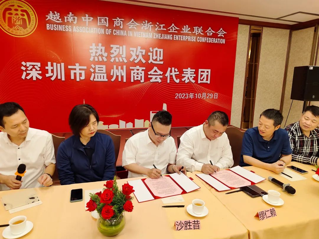 越南中国商会浙江企业联合会会长缪仁赖对深圳市温州商会代表团的到访表示热烈欢迎,并简要介绍商会的发展历程。他表示,目前,在越南约有400多家浙江籍企业、工厂及经营户,直接投资超过80多亿美金。据不完全统计,在越打拼的浙江侨胞数千人,且数量还在不断增多。随后,缪仁赖会长分享了越南经济、社会、文化等方面的现状,以及中资企业在越投资经营的经验及将来发展方向,受到大家的高度关注。沙胜昔代表商会对缪会长及越南中国商会浙江企业联合会同仁的盛情款待表示感谢,随后就深圳市温州商会的基本情况和取得的成绩作了简要介绍。他表示现在各行各业都有温商的优秀代表,温商群体在社会发展的不同阶段,都善于抓住机遇,克服困难,敢想敢做。希望两家商会加强合作,共享新机遇。同时,热忱邀请会长缪仁赖率团来深圳考察交流,再叙兄弟情谊、共谋发展。会上,越南中国商会浙江企业联合会同仁就我会企业家共同关心的问题如越南的营商环境和中国企业在越南设立子公司相关优惠政策等进行了热情解答。为进一步发展双方友好关系,加强交流协作,经过双方友好协商,深圳市温州商会与越南中国商会浙江企业联合会正式缔结为“友好商会”。我会会长沙胜昔和越南中国商会浙江企业联合会会长缪仁赖共同签署两会缔结友好商会协议书。
