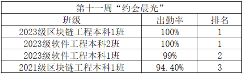 该活动按照各班级早读出勤率进行统计,根据各班级的真实出勤人数,晨读纪律等综合考查,评出前3个第十一周“约会晨光”先进班级。