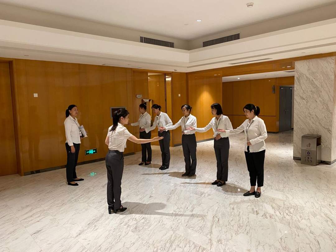 始终坚持全天候规范化秩序维护服务。大楼实行24小时封闭管理,交付至今重大安全事故率为零,秩序维护员平均年龄在30岁左右,退伍军人占比为45%,在每次重要接待保障中,秩序维护员按照高规格会务标准进行桌椅摆放布置。