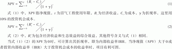 成本收益分析法是对社会活动成本和收益之间关系分析的最基本方法,可以反映某种经济行为可能产生的结果,为决策提供参考[9],一般主要核算经济上的投入和产出。然而沼气的综合利用除了有经济效益外,还具有生态效益,因此,该文主要采用考虑生态效益的一体化成本效益分析评价体系[10],既分析沼气工程的经济效益,也分析其外部经济性收益。计算该项目的净现值(NPV),用以估计其是否可行。此外,计算其内部收益率(IRR),作为该项目是否值得投资的参考标准。其计算公