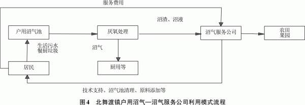 2006年原农业部发行的《全国农村沼气服务体系建设方案(试行)》提出要因地制宜鼓励协会领办、个体承包、股份合作等多元运行机制。然而,沼气服务效果始终不太明显,致使许多户用沼气利用效率大大降低。漯河市舞阳县北舞渡镇的户用沼气和沼气服务公司结合的模式,充分激发了公司的组织能力和用户的自主潜能,二者相互配合,有效保障了户用沼气能够持续长期运行。其利用模式如图4。