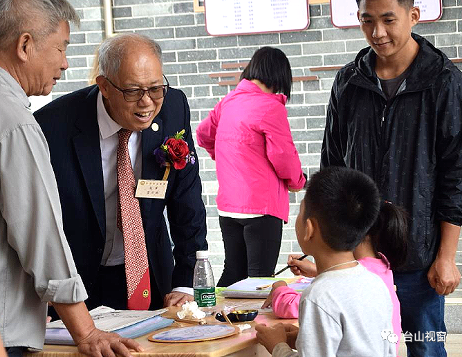 在书画练习室,嘉宾们认真察看孩子们练字练画,对孩子们的学习精神拍手鼓励。