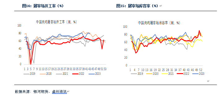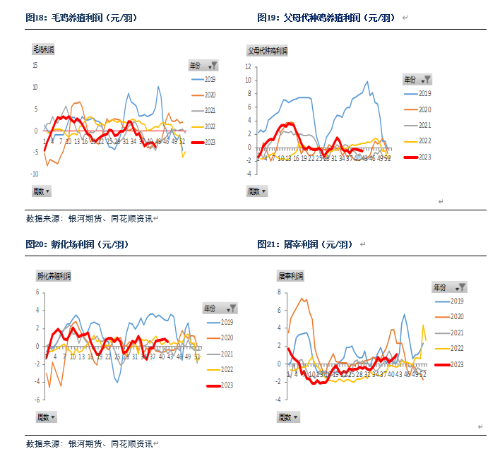 利润方面,2023年10月利润继续亏损。截止10月26日,白羽肉鸡平均利润为-2.1元/只,较上月下跌0.1元/只。10月虽然饲料成本下跌,鸡苗价格也在小幅下跌,但由于毛鸡价格下跌,10月养殖利润仍继续亏损。但10月由于毛鸡价格下跌,屠宰利润较高,截止10月26日,屠宰利润为1.97元/只,高于9月底的1.4元/只。由于11月饲料成本维持低位,毛鸡供应减少,预计11月毛鸡利润会走高,预计11月毛鸡利润在-2到1.5元,屠宰利润可能由于毛鸡上涨会下跌,屠宰利润为0-2元。