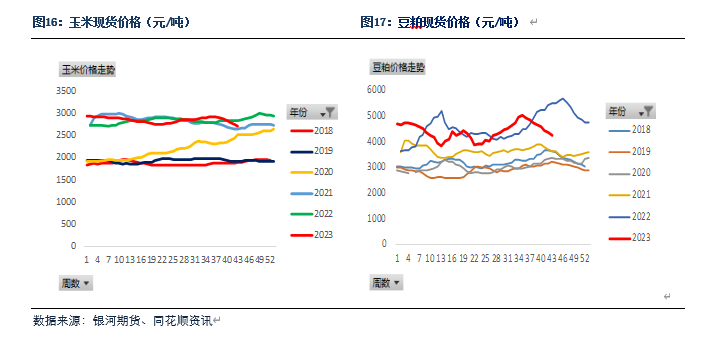 饲料方面:由于10月华北玉米及东北玉米陆续上市,玉米现货下跌较多。华北玉米跌到2700元/吨附近,黑龙江部分地区跌破2200元/吨,10月的玉米均价在2622元。对于豆粕,10月豆粕节后持续下跌,豆粕均价已跌至4218元/吨,对于饲料价格,10月饲料价格也大幅下跌。11月由于玉米仍有下跌空间,但空间相对有限,豆粕现货相对稳定,预计11月饲料价格波动较小,相对稳定。