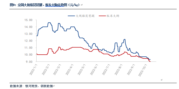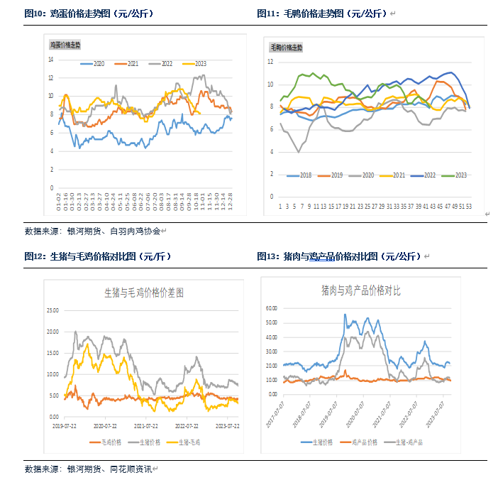 替代品生猪和鸡蛋价格下跌较多。由于10月节后消费低迷,叠加部分地区有猪瘟影响,部分养殖场抛售生猪,鸡蛋现货也在下跌,10月替代品全线下跌,带动鸡产品价格也会偏弱。但11-12月消费旺季,生猪和鸡蛋仍有上涨可能,鸡产品也会偏强。